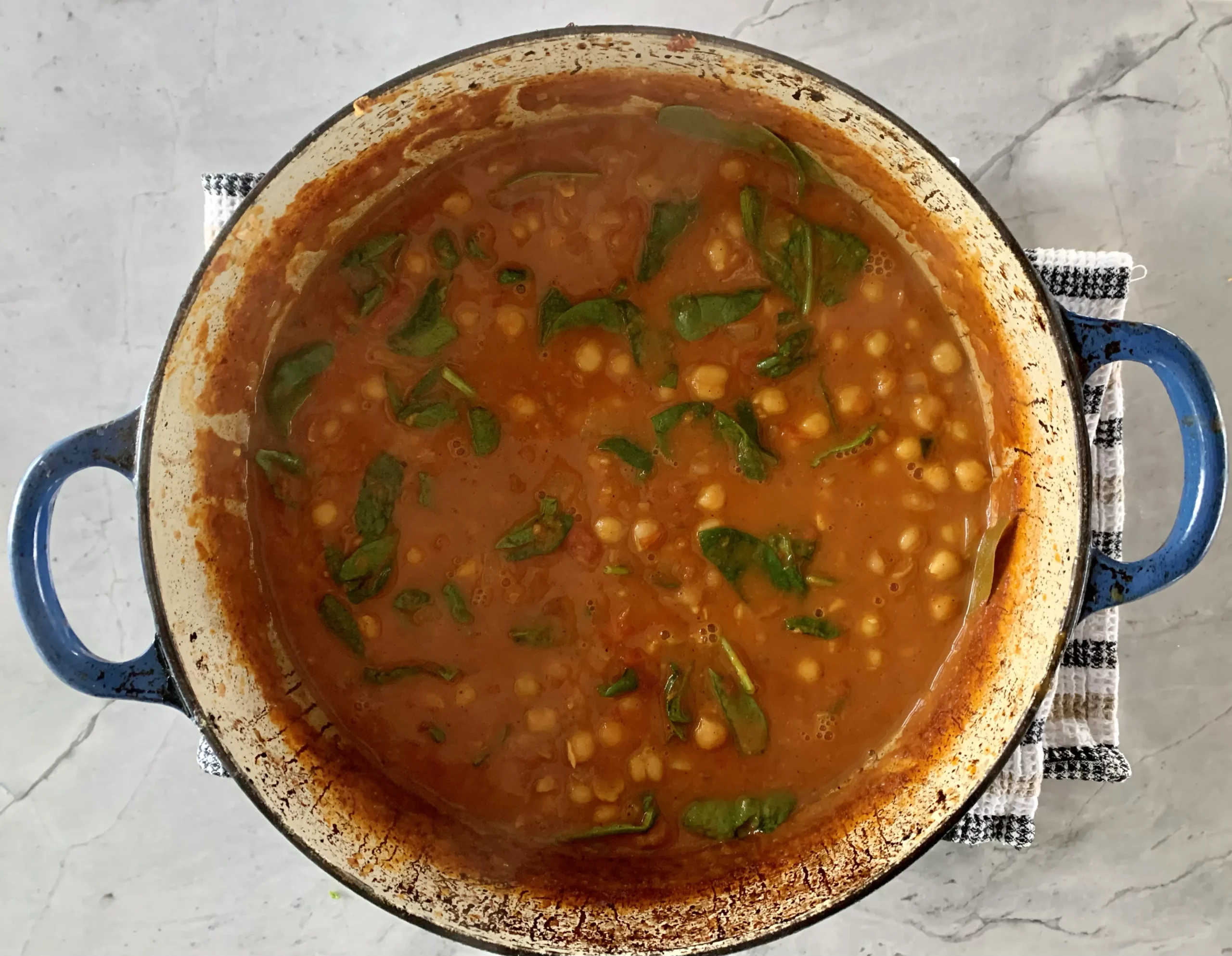 Add tomatoes, chickpeas and broth and increase heat and bring to a simmer. Cook for 20-25 minutes.